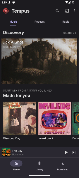 Tempus does not rely on magic algorithms to decide what you should listen to. Instead, the interface is built around your listening history, randomness, and optionally integrates with services like Listenbrainz.org and Last.fm to personalize your music experience (These must be supported by your backend).