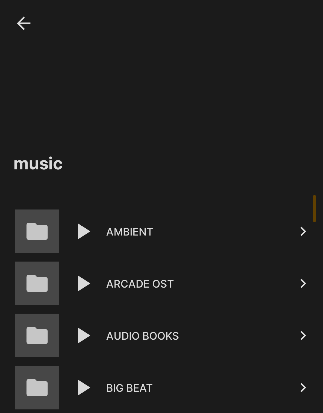 - The Library ▸ Music folders screen shows each top-level folder with a play icon only after you drill into it. The root entry remains a simple navigator.